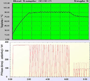 Protože miluji polévky, neopomenul jsem připravit polévku z uzeného kolene, 3 l vody asi 5 brambor, zeleniny a koření jsem připravoval zbytečně dlouho, tedy 6 hodin při nižší teplotě. Poté se aktivovala funkce dohřívání, což je patrné i na grafu.